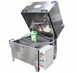Рабочее пространство: 800x500x300 мм. Объем моющего бака 75л. Масса детали до 70 кг. Итальянский насос! Сделано в России. Ручная мойка для деталей ТС800 РМ позволяет максимально качественно обработать поверхности со сложной геометрией, глухие отверстия и укомплектована надежным насосом, качественными фитингами, ТЭНами из нержавеющей стали, европейской электрикой. Корпус изделия выполнен из стали AISI430, толщиной 2,0 мм.