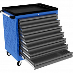 7 ящиков. Оборудована большой прочной пластиковой ручкой. Корпус тележки оснащен защитными бортами, что сводит к минимуму риск повреждения оборудования и нанесение травм автомеханикам во время перемещения по СТО. Выдвижные ящики оснащены нескользящими вкладками. В комплекте предусмотрен верхний коврик из АБС, предназначенный для удобного хранения различных мелких деталей. Перфорированные боковые стенки с квадратными отверстиями предоставляют возможность разместить дополнительные аксессуары для хранения инструментов. Размеры собранной тележки: 485х720х1020 мм.