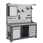 Нагрузка на столешницу 1500 кг. Столешница из листа влагостойкой фанеры марки ФСФ толщиной 40 мм и листом горячекатаной стали толщиной 5 мм. Рама верстака выполнена их холоднокатаной стали. Модуль верстака выполнен сварными. Ящики в модулях устанавливаются на шариковых телескопических направляющих полного выдвижения. Квадратная перфорация для установки крючков, держателей. Размеры: 1982x1493x743 мм.