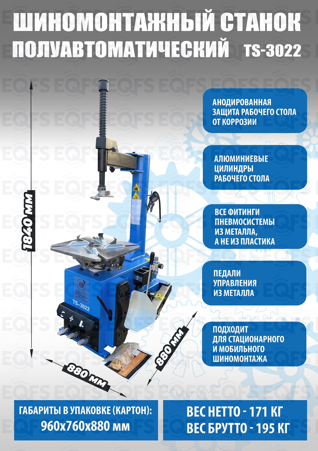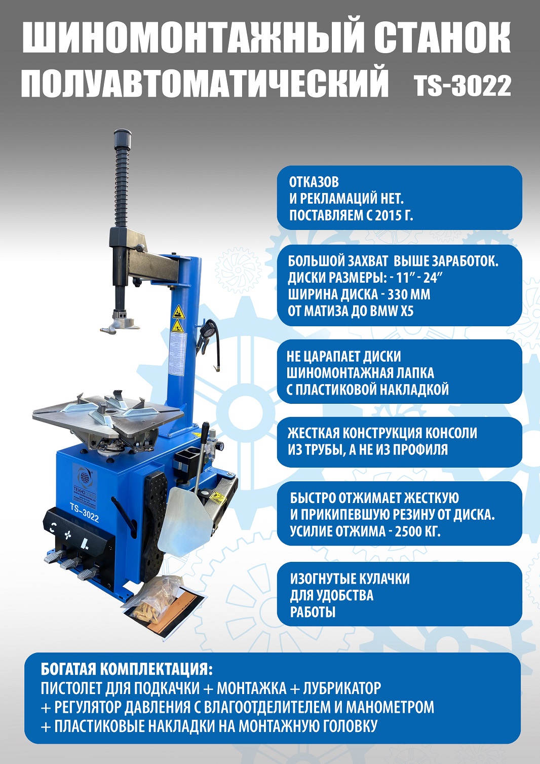TS-3022 Станок шиномонтажный. Для дисков 11-24”. В комплекте: пистолет для подкачки шин + монтажка + регулятор давления с влагоотделителем и манометром. Оптимальный вариант из соотношения цена/функционал. Самый продаваемый станок последних лет! Для монтажа и демонтажа колес легковых автомобилей, легких грузовиков, не больших автобусов и коммерческой техники. Рекомендуется для постов со средней и высокой проходимостью. Поставляем на 220В и 380В.