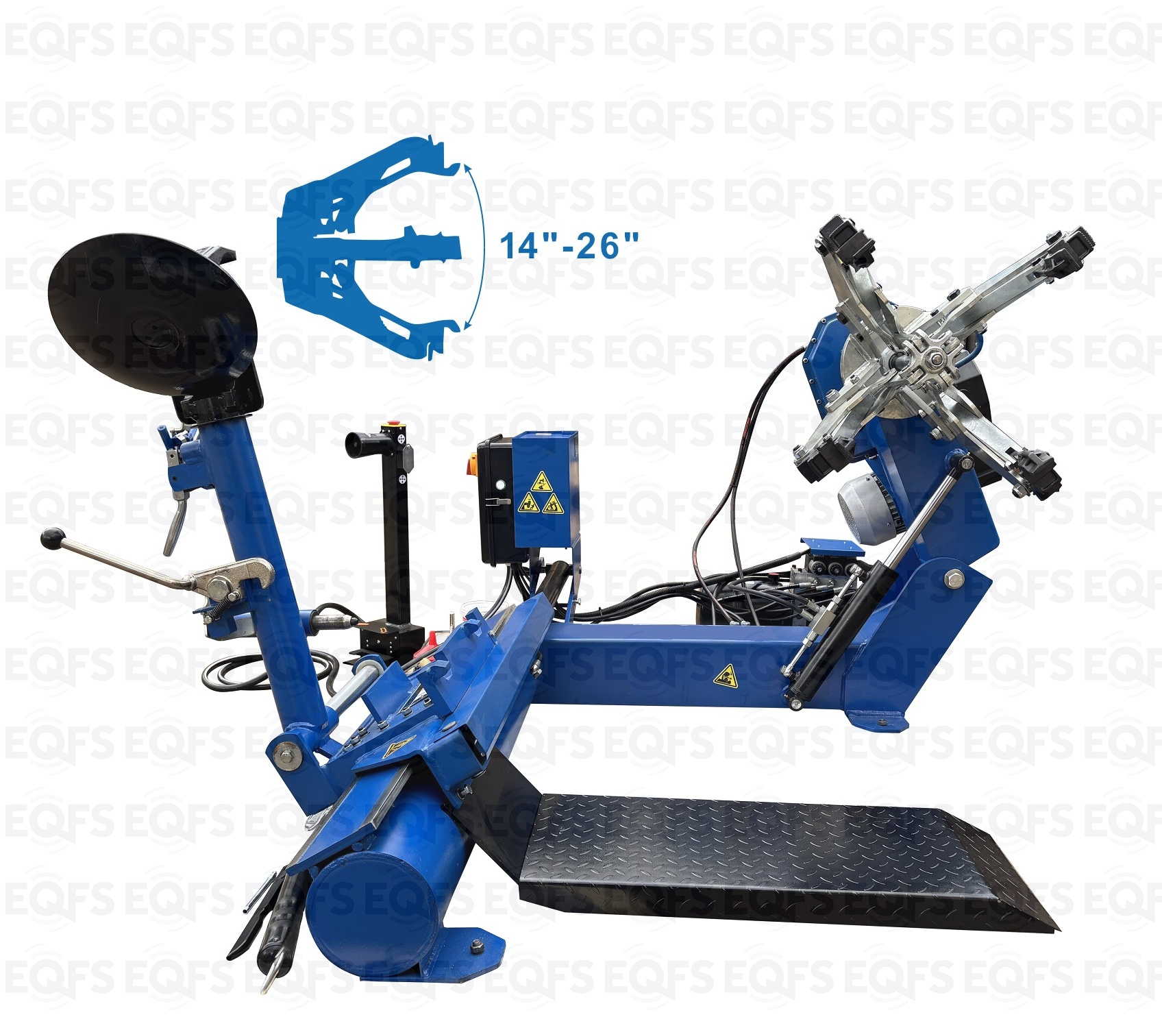 Шиномонтажный станок полуавтомат. На станке установлены Моторы 3 + 2,2 кВт - у конкурентов 1,5 + 1,8 кВт. Диски сталь, AL, с кольцами и без, 14÷26” с адаптерами 14÷42”, Колесо макс. Ø 1600 ширина 780 мм, до 500кг. Отжим min-max. 2500-6300 кг. Для грузового шиномонтажа автомобилей, автобусов, дорожной техники, сельхозмашин. Гарантия до 18 мес.