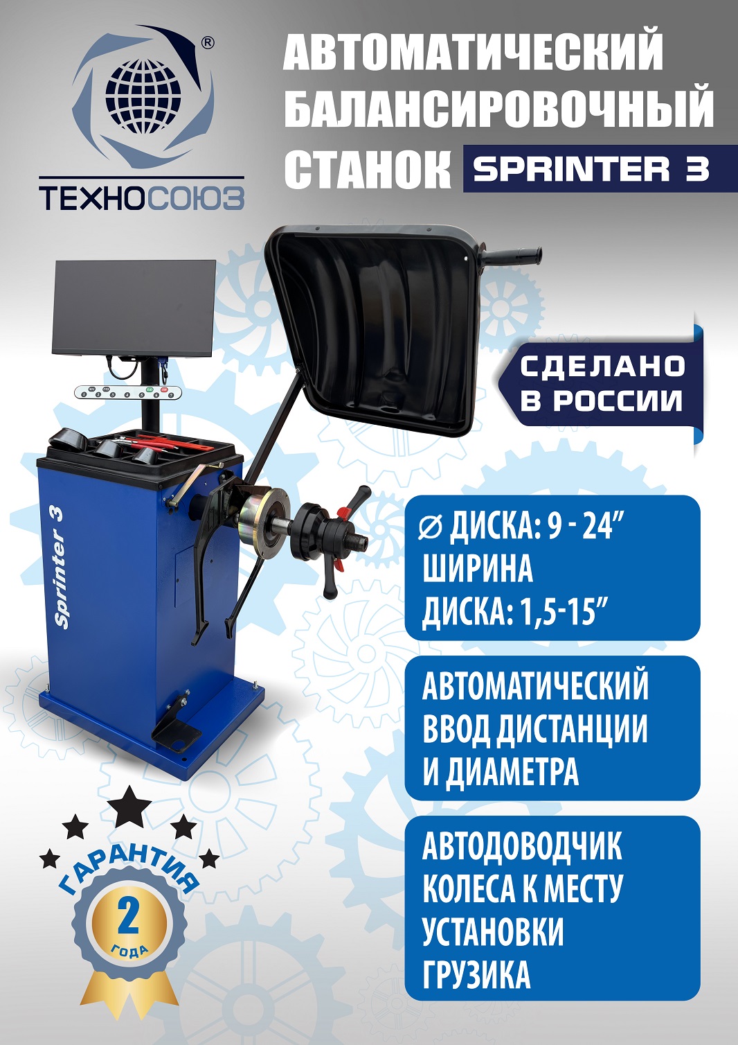 Балансировочный станок Sprinter 3. ПРОИЗВОДСТВО РФ. Автомат. LCD Монитор с понятным управлением. Автоматический и прямой ввод всех параметров для колес с алюминиевыми дисками. Автоматический доводчик. Автоматическое закручивание гайки. Электронная линейка. Многофункциональная педаль управления для работы без нажатия кнопок. Статистика и учет расхода грузиков. Вал 40 мм шлифованный. Для колёс легковых авто и коммерческого транспорта с диаметром диска с резиной до 850 мм. Размеры диска: ширина 1–15” , диаметр диска 9–24”. Вес колеса 65 кг. Гарантия 2 года.
