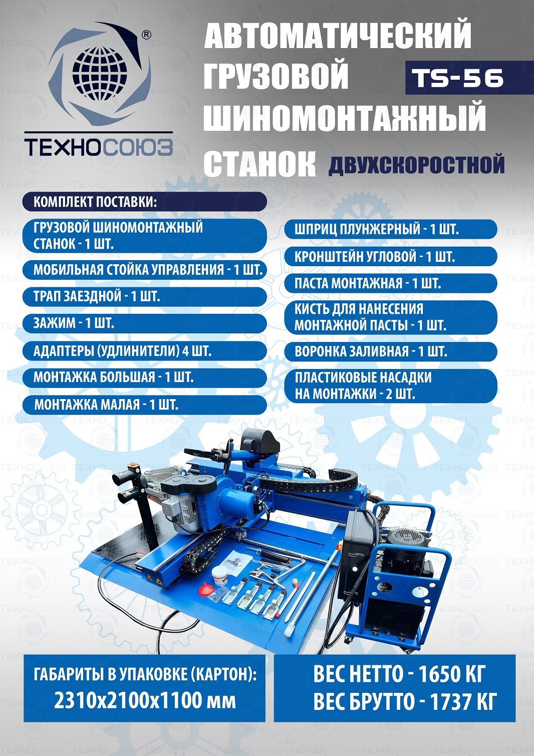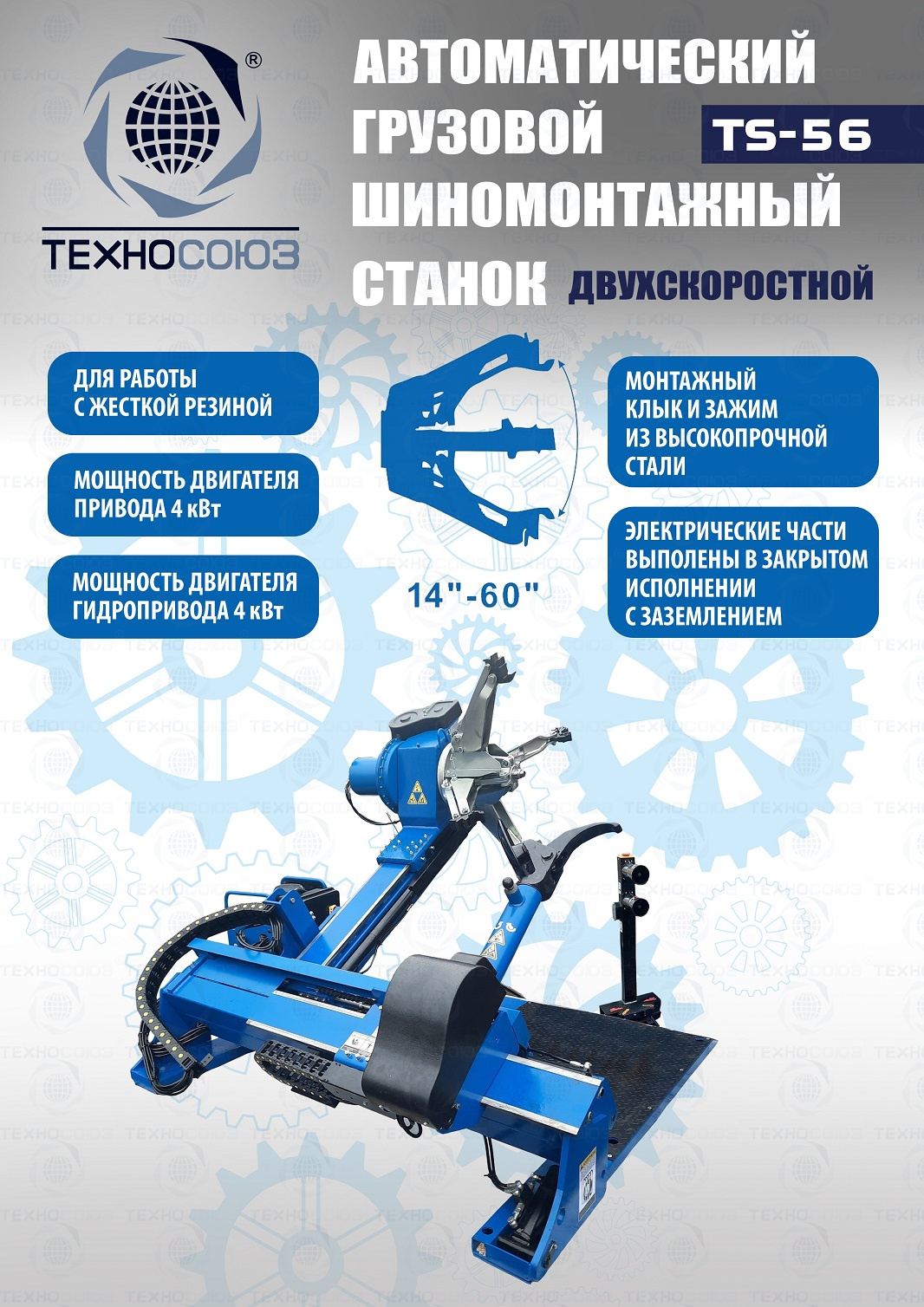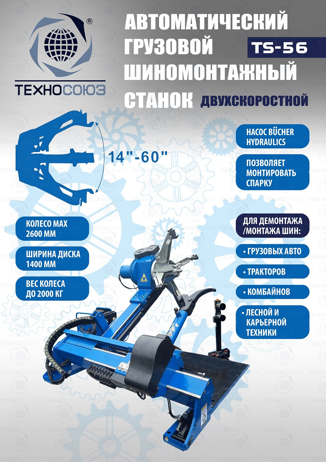 Грузового автоматического шиномонтажного станка TS-56 до 60". Двухскоростной. Моторы 4 + 4 кВт. Гидравлический насос – «BUCHER HIDRAULICS». Диски ALU, сталь, с кольцом и без 14÷60”. Колесо макс. Ø2600 мм, делает колеса "спарку" с шириной диска до 1400 мм. Вес колеса до 2000 кг. Гарантия до 18 мес. Для тракторов, комбайнов, лесной и карьерной техники