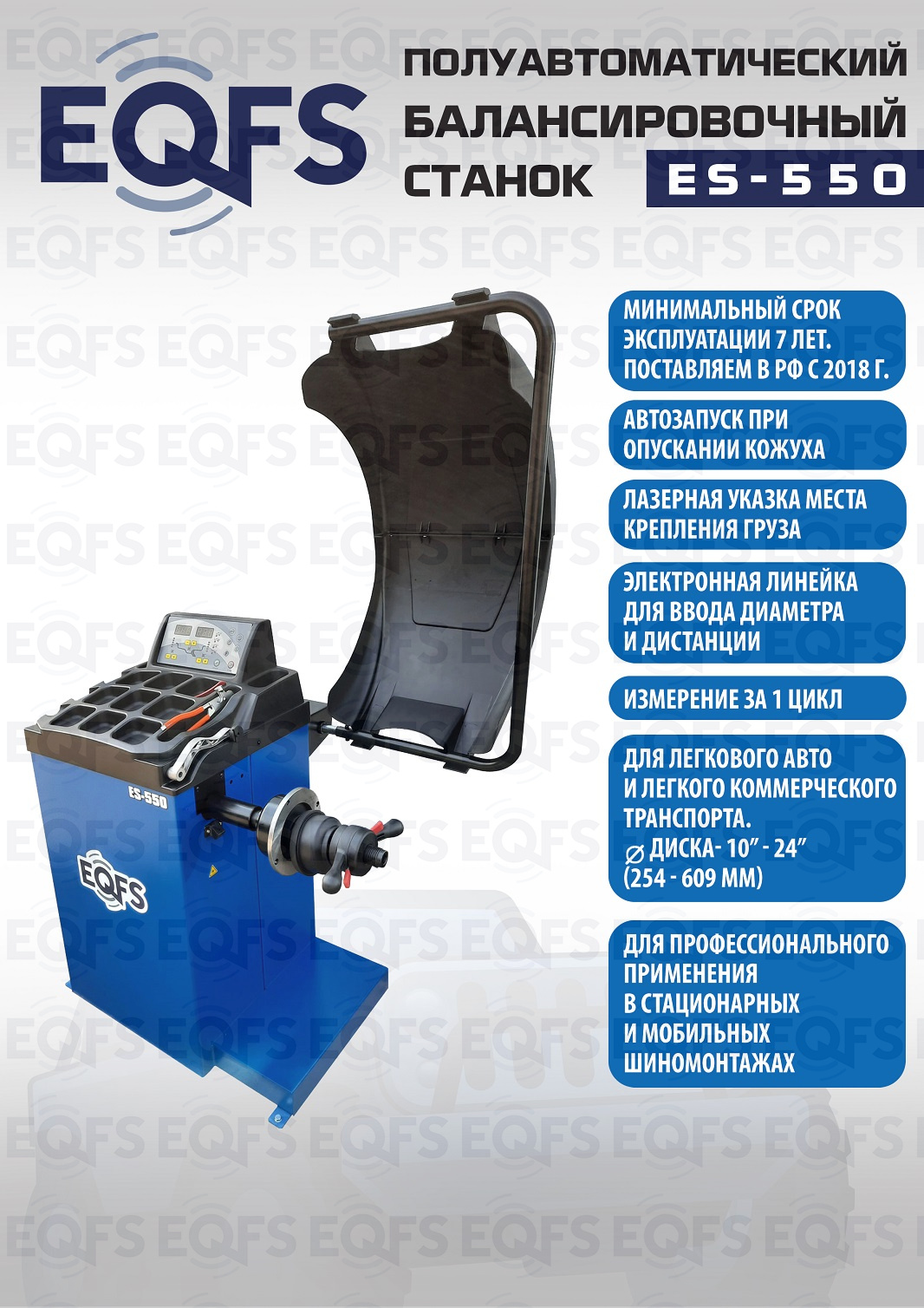 ES-550 Балансировочный станок. Полуавтомат. Удобный и понятный интерфейс. Автозапуск опусканием кожуха. Автоматический ввод дистанции и диаметра диска. Лазерная навигация. Автокалибровка. Для колес легковых автомобилей, мотоциклов, «Газелей», «Спринтеров» с диаметром диска с резиной до 800 мм. Размеры диска: ширина 3–10” (76-254 мм) , диаметр диска 10–24” (254÷609 мм). Вес ≤ 65 кг. Вал- 36 мм. Точность ±1гр. 220 В. Режимы работы DINAMIC, STATIC, ALU1, ALU2, ALU3, ALUS, ST. Гарантия 12 мес.