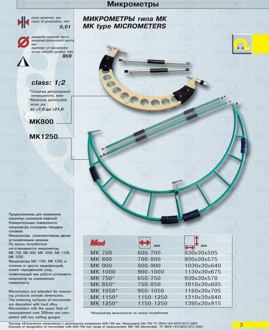 Цена деления 0,01 мм. Диапазон измерения от 700-800 мм. Для измерения наружных размеров изделий. Измерительные поверхности микрометра оснащены твердым сплавом. Микрометры укомплектованы установочная мера 2 шт. Класса точности 1. ГОСТ 6507-90. Поставляется в двух вариантах с поверкой и без поверки!