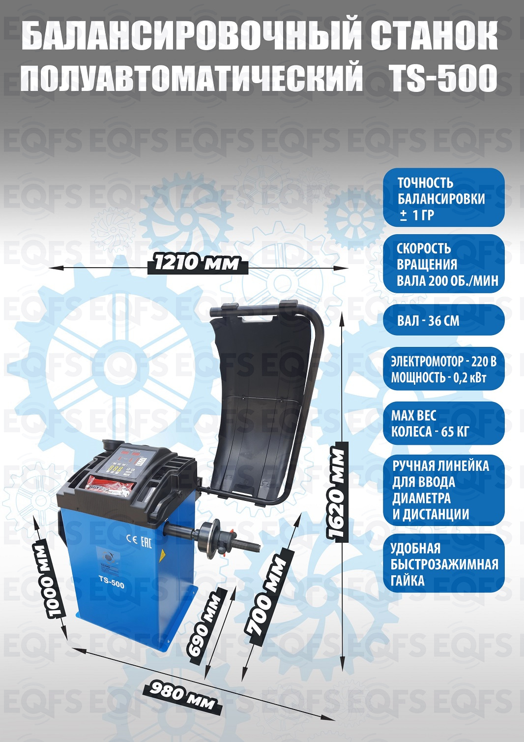 TS-500 Полуавтоматический балансировочный станок. В комплекте: кожух с автозапуском + клещи + кронциркуль + быстрозажимная гайка + набор конусов. Для колес диаметром до 760мм. Размеры диска: ширина 3–9” (76-228 мм) , диаметр колеса" - 10–21” (254-533 мм). Максимальный вес колеса с диском – 65 кг. C кожухом. Точность ±1гр. Напряжение 220В.