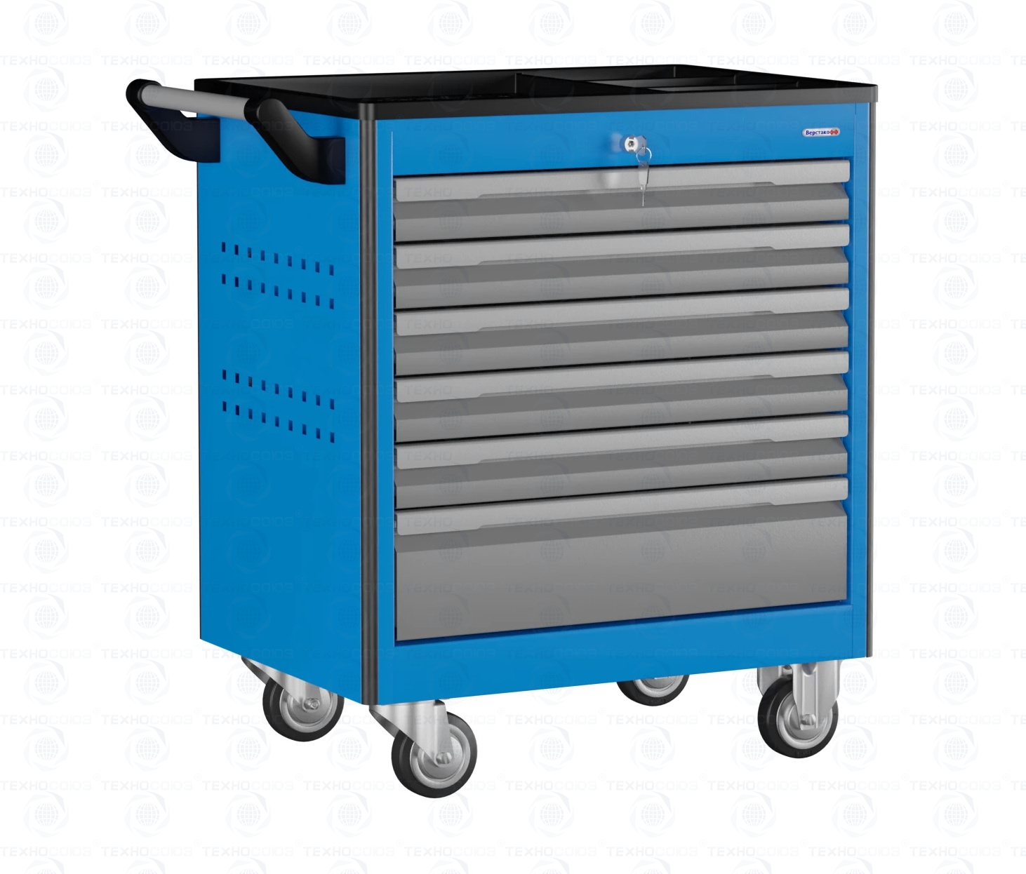 6 ящиков. Нагрузка на тележку 220кг. Корпус тележки сварной. Тележка оснащена системой антиопрокидывания новой конструкции, которая блокирует открывание ящиков. На боковых стенках корпуса выполнена квадратная перфорация для установки крючков, держателей и других аксессуаров. Ящики на шариковых телескопических направляющих полного выдвижения. Обеспечен свободный и плавный ход ящиков даже при полной загрузке. Габаритные размеры тележки с учетом колес, лотка и ручки (ВхШхГ), не более: 800x780x490 мм. Вес: 47,7 кг.