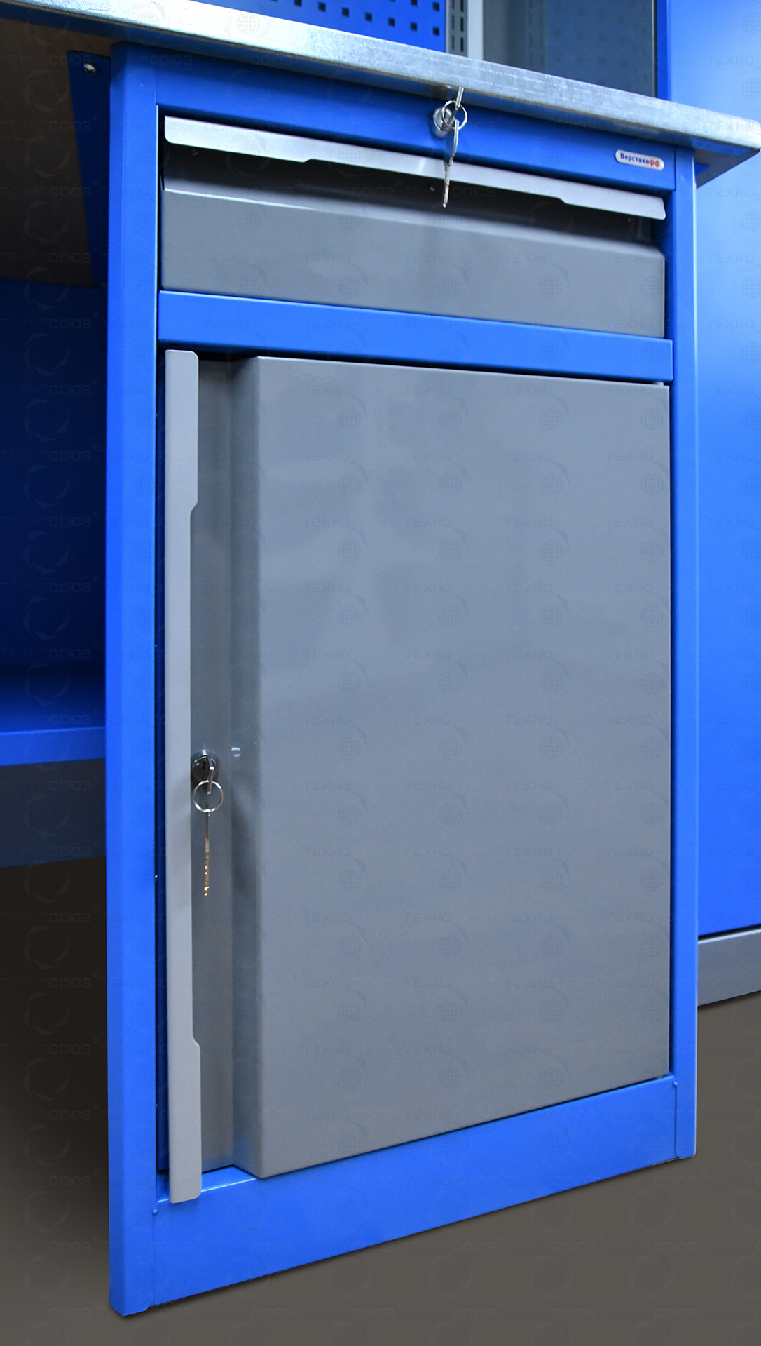 Тумба верстака - сварная. Ящики в тумбе устанавливаются на шариковых телескопических направляющих полного выдвижения. В тумбе P8 установлен малый ящик и имеется отделение с дверью и одной полкой. Внутренние размеры малых ящиков (ВхШхГ), не более: 103 х 397 х 520 мм. Ящик снабжен центральным замком с поворотом ригеля 180 градусов и подпружиненной тягой. В комплекте два ключа. Полка устанавливается на парах специальных формованных зацепов, выполненных в боковых стенках тумбы. Имеется возможность смены стороны открывания двери. Дверь тумбы снабжена центральным замком с поворотом ригеля 180 градусов. В комплекте имеется два ключа.